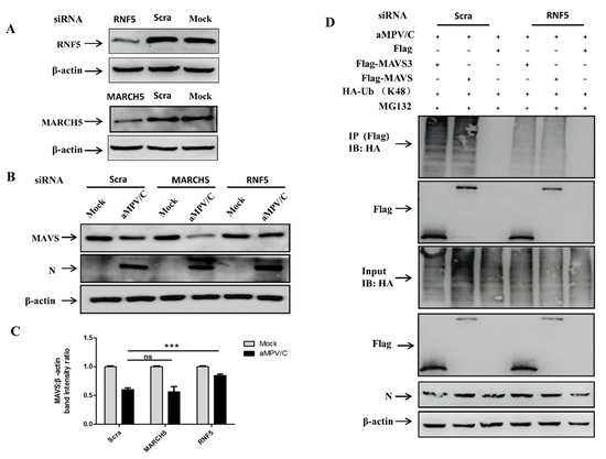 E3 ubiquitin ligases for MAVS degradation are screened and identified in aMPV/C-infected Vero cells. (A) Vero cells were transfected with 40 pmol MARCH5-siRNA (MARCH5), RNF5-siRNA (RNF5), and scrambled-siRNA (Scra) and were detected at 48 h by Western blotting with anti-MARCH5, -RNF5, or β-actin antibody. (B) Vero cells were transfected with 40 pmol MARCH5-siRNA (MARCH5), RNF5-siRNA (RNF5), or scrambled-siRNA (Scra) and then were infected with aMPV/C for 48 h. Cells were harvested and analyzed using Western blotting with anti-MAVS, anti-N, or anti-β-actin antibody. (C) Representative results are displayed with graphs corresponding to the ratios of MAVS: β-actin normalized to the control conditions. (D) 40 pmol RNF5-siRNA (RNF5), or scrambled-siRNA (Scra) transfected Vero cells were co-transfected with Flag, Flag-MAVS3, or Flag-MAVS and HA-Ub. The cells were infected with aMPV/C and analyzed as described in A. Error bars represent mean ± SD of three independent experiments. ns (not significant) p > 0.05; *** p < 0.001, compared with the Scra group.