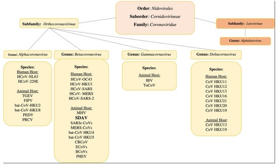 Taxonomy graph of the Coronaviridae family. Own work based on ICTV 2020 [36]. Abbreviations: alphacoronaviruses: HCoV-NL63 (human coronavirus NL63), HCoV-229E (human coronavirus 229E), TGEV (transmissible gastroenteritis coronavirus), FIPV (feline infectious peritonitis virus), bat-CoV-HKU2 (Rhinolophus bat coronavirus HKU2), bat-CoV-HKU8 (Rhinolophus bat coronavirus HKU8), PEDV (porcine epidemic diarrheal virus), PRCV (porcine respiratory coronavirus); Betacoronaviruses: HCoV-OC43 (human coronavirus OC43), HCoV-HKU1 (human coronavirus HKU1), SARS (severe acute respiratory syndrome coronavirus), MERS (Middle East respiratory syndrome coronavirus), SARS-CoV-2 (Severe acute respiratory syndrome coronavirus -2), MHV (mouse hepatitis virus), SDAV (sialodacryoadenitis virus), bat-CoV- HKU4 (Tylonycteris bat coronavirus HKU4), bat-CoV-HKU5 (Pipistrellus bat coronavirus HKU5), CRCoV (canine respiratory coronaviruses), ECoVs (equine coronaviruses), BCoVs (bovine coronaviruses), PHEV (porcine haemagglutinating encephalomyelitis virus); Gammacoronaviruses: IBV (infectious bronchitis virus), TuCoV (turkey coronaviruses); Deltacoronaviruses: CoV HKU11 (bulbul CoV HKU11), CoV HKU12 (thrush CoV HKU12), CoV HKU 13 (munia CoV HKU13), CoV HKU16 (white-eye CoV HKU16), CoV HKU19 (night heron CoV HKU19), CoV HKU20 (wigeon CoV HKU20), CoV HKU21 (moorhen CoV HKU21).