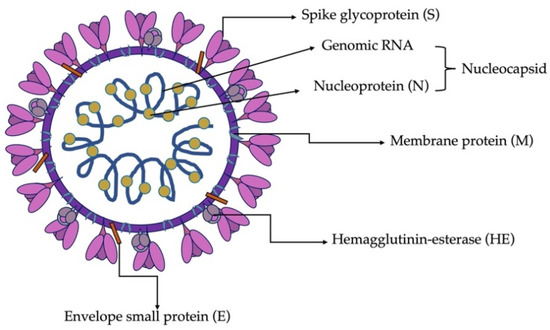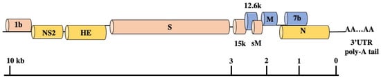 The architecture of a SDAV virion, as in all coronaviruses, is spherical with a diameter ranging from 80 to 180 nm, as confirmed by tomography and cryo-electron microscopy [10]. It consists of a genomic core made up of non-segmented, positive sense, ssRNA stabilized by a nucleocapsid protein and surrounded by a viral membrane envelope. The most characteristic feature of all coronaviruses is the presence of tentacle-shaped spikes, emanating from the surface of the virion and giving it the appearance of a corona, hence the name. CoVs have a helically symmetric nucleocapsid, which is rare among positive sense RNA viruses and much more common in negative sense RNA viruses [41,42,43]. As Barker et al. (1994) and Yoo et al. (2000) described, SDAV contains four major coronaviral structural proteins and one present only in a few species of CoVs. These are the spike (S), membrane (M), envelope (E), nucleocapsid (N) proteins, and hemagglutinin esterase (HE), all of which are encoded at the 3′ end of the viral genome [42,43] (Figure 3).