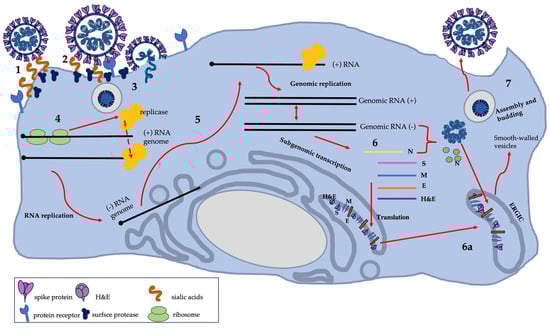 The scheme of SDAV replication: own work based on available knowledge. (1) SDAV HE probably mediates weak interactions with abundant host cell surface sialates, keeping the virus concentrated on cells before connecting S protein with the still unknown cell receptor. (2) S-glycoproteins then bind to protein receptors and are proteolytically activated (by cutting with specific proteases: TMPRESS2 or furin) into two subunits, S1 and S2, to conformations that induce membrane fusion. (3) Virus–cell fusion involves S binding to sialic acids. The likely route of entry into the cell is cell–virus fusion associated with S-protein connections to sialic acids. Connections to host cell receptors may not be required for this process, thus allowing distribution, beginning with the binding of viral protein S (RBD/S1) on the host cell receptor, driving a conformational change in the S2 subunit and facilitating its fusion with the plasma membrane and ultimately the release of viral genome (+ ssRNA) into the cytoplasm. However, the route by which SDAV enters the cell is still unknown and also can be mediated by acidified endosomes. (4) Promptly, the translation produces nonstructural pp1a and pp1ab co-terminal polyproteins (pp1a and pp1ab) that are proteolytically cleaved and assembled into a functional replicase–transcriptase complex: RTC. (5) Viral RNA synthesis produces copies of gRNA, as well as a nested set of sgRNA. This is possible by discontinuous transcription of a negative-sense RNA intermediate. (6) Following replication and sgRNA synthesis, various structural and accessory proteins are translated into the endoplasmic reticulum (ER) and (6a) then assembled as virion in the endoplasmic reticulum-Golgi intermediate component (ERGIC), along with viral genomes encapsulated by N protein budded into membranes of the ERGIC. (7) Then, virions are transported in vesicles and exit cells via exocytosis.