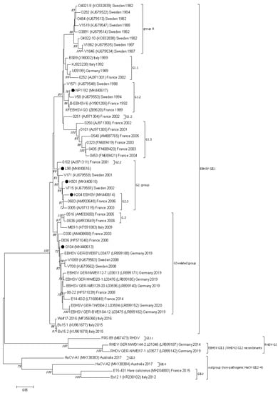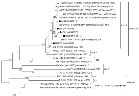 For the phylogenetic analysis, 10 full EBHSV genome sequences, 46 VP60 complete EBHSV sequences, and 10 VP10 complete EBHSV sequences, available in GenBank, were used. These comprised virus strains of particular EBHSV genogroups detected in Sweden (KC832838–39, KJ679513–14, KJ679522, KJ679534–35, KJ679547–48, KJ679553, KJ679558–59, and KJ679562–63), France (AJ971301, AJ971304–06, AJ971311, AJ971315, AM408588, AM887765, AM933648–50, FN689419–21, HF571039–40, KY801206, LT168848, and Z69620), Italy (X98002, KF591083, KJ923230, KU961677–78, and MF356366) and Germany (U09199, LR899140, LR899152, LR899171, LR899182, LR899185, and LR899188). Additionally, six sequences of nonpathogenic HaCV and rabbit calicivirus (RCV) lagoviruses from France (MH204883), Italy (KR230102) and Australia (EU871528 and MK138383–85), as well as RHDV (genotype GI.1b, M67473), and two EBHSV/RHDV2 (LR899142 and LR899187) recombinant strains were also included.