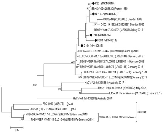 The phylogenetic Maximum Likelihood tree constructed using the ORF1–ORF2 (21–7350 bp) nucleotide sequences of European EBHSV strains and other hare and rabbit caliciviruses. Bootstrap values (1000 replicates) greater than 70% are shown at the corresponding tree nodes. The tree is drawn to scale with branch lengths in the same units as those of the evolutionary distances used to infer the phylogenetic tree. Evolutionary analyses were conducted using MEGA7 [37]. The rabbit hemorrhagic disease virus—RHDV (GI.1c), EBHSV GII.1/RHDV2 GI.2 recombinants, and rabbit calicivirus RCV–A1 (GI.4) were used as an outgroup to root the tree. EBHSV strains from Poland are marked by black dots.