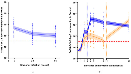 Longitudinal course of SARS-CoV-2 S-IgG antibody levels after infection and vaccination. Red dotted line = manufacturer’s positive cut-off at 33.8 BAU/mL. (a) S-IgG levels in 40 subjects post-infection over one year, excluding subjects at 55 weeks that received a vaccination in-between follow-ups. (b) S-IgG levels after homologous (blue) and heterologous (orange) vaccination. Dotted vertical lines = time of booster vaccination for homologous (blue) and heterologous (orange) vaccination regimen.