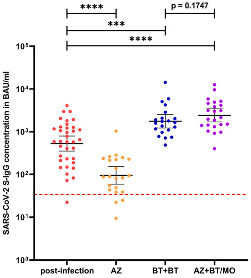 Comparison of S-IgG antibody concentrations about seven weeks post-infection (red), five weeks after prime vaccination with AZD1222 (orange) or BNT162b2 (=two weeks after homologous booster vaccination, blue), and four weeks after heterologous booster vaccination (purple). Red dotted line = manufacturer’s positive cut-off at 33.8 BAU/mL. Abbreviations: AZ = AZD1222, BT = BNT162b2, MO = mRNA-1273. Significance levels: *** p value < 0.001, **** p value < 0.0001.