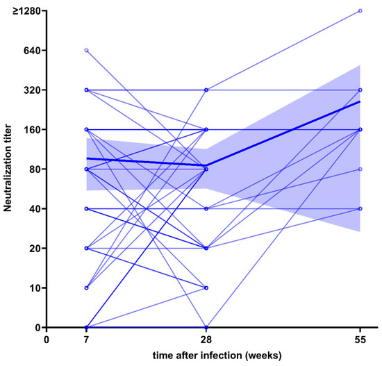 Longitudinal course of neutralization titers in 40 serum samples of participants after infection with SARS-CoV-2 over 28 weeks, with data for 11 serum samples over 55 weeks. The highlighted blue graph shows the mean neutralization titer with its 95% confidence interval.