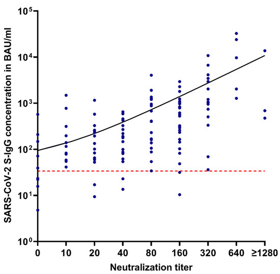 Correlation of neutralization titers and SARS-CoV-2 S-IgG antibody concentrations in BAU/mL. Red dotted line = manufacturer’s positive cut-off at 33.8 BAU/mL.