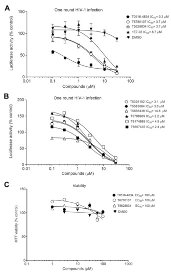 Next, we determined IC50s for one round of HIV-1 inhibition of the nine identified compounds. CEM T cells were infected with HIV-1-LUC-G for 24 h followed by treatment with the selected compounds for another 48 h (Figure 2A,B). The three compounds that showed consistent HIV-1 inhibition were T0516-4834 (IC50 = 0.3 μM), T6780107 (IC50 = 3.7 μM) and T5628834 (IC50 = 3.7 μM) (Figure 2A). These compounds inhibited HIV-1 with lower IC50s compared to the previously reported HIV-1 transcription inhibitor, 1E7-03 (IC50 = 8.7 μM) [15] (Figure 2A). The rest of the compounds showed either upregulation of HIV-1 infection at lower concentrations or inefficient inhibition (Figure 2B). None of the compounds showed any toxicity under 100 μM concentrations when tested in 3-(4,5-dimethylthiazol-2-yl)-2,5-diphenyltetrazolium bromide (MTT) assay (Figure 2C).