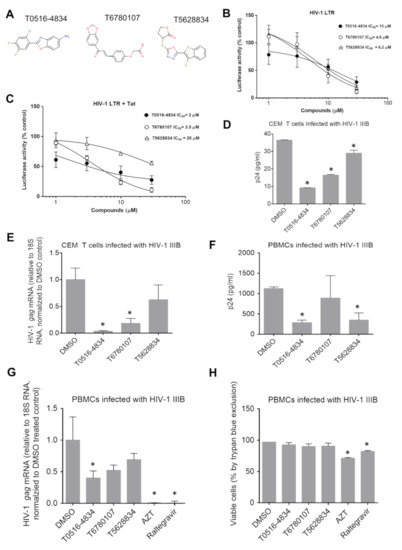 To further characterize the antiviral activity of the selected compounds in primary cells, we tested their effect on PBMCs infected with HIV-1 IIIB. We observed the strongest reduction in p24 (4-fold reduction) and gag mRNA (2.5-fold reduction) in the T0516-4834 treated PBMCs (Figure 3F,G). No significant effect was observed for T6780107, whereas T5628834 treatment showed only p24 reduction (3.2-fold reduction) (Figure 3F,G). We also observed a strong (10-fold) reduction in HIV-1 nef mRNA by T0516-4834 (Figure S3).