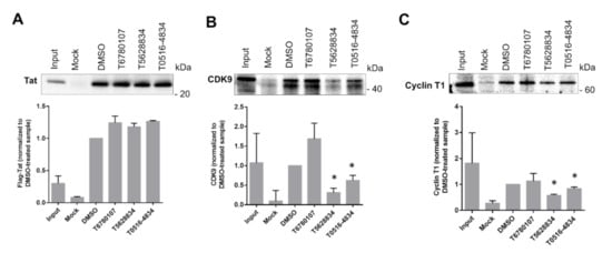 As only one compound disrupted Tat–TAR RNA interaction, we extended our analysis to evaluate whether other inhibitory compounds might have an effect on Tat interaction with CDK9/cyclin T1 complex and, thus, inhibit HIV-1 transcription. We utilized immunoprecipitation assays using cell lysates collected from 293T cells co-transfected with Flag-Tat for 24 h, followed by treatment with the 20 μM compounds for another 24 h. Immunoprecipitations were carried out with protein A/G agarose beads that were pre-blocked with BSA and then incubated with cell lysates. Anti-Flag antibody was used to precipitate Flag-tagged Tat and the Tat-associated proteins that were eluted from the beads with SDS-PAGE loading buffer resolved on SDS-PAGE and detected with different antibodies. Tat protein expression levels were slightly increased in the cells treated with any of the tested compounds (Figure 5A). Among the tested compounds, T5628834 had the strongest effect (4-fold reduction) on CDK9 associated with Tat (Figure 5B). Compound T0516-4834 showed a moderate reduction (1.4-fold) in CDK9 associated with Tat and compound T6780107 had no effect (Figure 5B). Cyclin T1 protein levels associated with Tat were reduced by the T5628834 compound (1.6-fold reduction), whereas the T0516-4834 compound showed less than 20% reduction and the T6780107 compound had no significant effect (Figure 5C). To exclude the effect of the compounds on the cellular levels of CDK9 and cyclin T1, we additionally analyzed CDK9 and cyclin T1 in the cells treated with the compounds. We found no biologically significant reduction in the levels of CDK9 (Figure S5a) or cyclin T1 (Figure S5b).