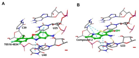 To visualize the T0516-4834 compound interaction with TAR RNA, we built an in silico model that shows binding of the discovered hit to the HIV-1 TAR RNA bulge formed by U23, U25, C39, G26,C39 and U40 (Figure 6A). The top performing compound, benzoxazole T0516-4834, binds into the crevice formed by these nucleotides forming a pi–pi staking interaction with U25 and U40 and its chlorine atom forms van der Waals contacts with the cleft formed by C39 and U40 (Figure 6A). The T0516-4834 compound showed similar binding as compared to a thienopyridine compound 2 [16], which interacts with TAR RNA within the same binding cavity and whose butterfly shape of the heterocycle allows formation of extensive pi–pi stacking interactions with the U25, G26 and U40 bases (Figure 6B).