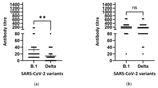 SARS-CoV-2 neutralizing antibody titres against SARS-CoV-2 B.1. and B.1.617.2 isolates measured by serum-neutralization. The mean values and standard error bars are presented. Serum samples of vaccinees collected 21 days after the first vaccine dose (a). Serum samples of the same vaccinees collected 10 days after the second vaccine dose (b). Antibody titre is plotted as the reciprocal of the highest serum dilution able to inhibit the virus cytopathic effect. Each dot represents one tested serum sample. Serum donors were vaccinated with BNT162b2 (Comirnaty, Pfizer/BioNTech mRNA vaccine). Comparison of neutralizing antibody titres by SN in 30 serum samples against B.1 and B.1.617.2 (Delta) was performed with the non-parametric Mann–Whitney test; ** p = 0.0015. ns, non-significant. Figures were obtained by GraphPad Prism 9 software (La Jolla, CA 92037, USA).