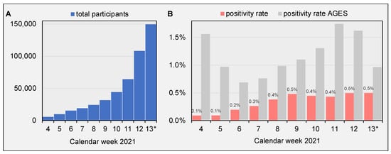 (A) Total number of weekly participants. During a study period of 66 days (25 January–31 March), a total number of 400,730 samples were collected. (B) Fraction of positive test results of total weekly tests (red bars). Grey bars represent total positivity rate of all tests conducted in Vienna as reported by the Austrian Agency for Health and Food Safety (AGES; https://covid19-dashboard.ages.at; accessed on 8 June 2021). * study period ended at day 3 of calendar week 13 (31 March).