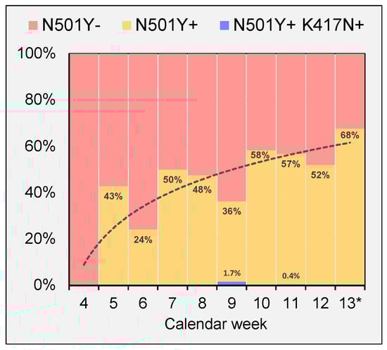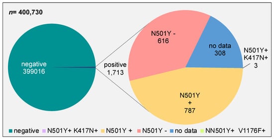 In total, SARS-CoV-2 PCR testing was performed on 400,730 samples of which 1714 (0.43%) tested positive (Figure 2). Of all viral strains detected, 787 (45.9%) carried the N501Y mutation (N501Y+), 615 samples (35.9%) tested negative for the N501Y (N501Y-) mutation and the N501Y melting curve analysis remained inconclusive for 312 samples (18.2%). For all N501Y+ samples, we additionally analyzed the presence of the K417N (K417N+) and V1176F (V1176F+) mutations. We identified three samples that were positive for the K417N and the N501Y mutation (N501Y+/K417N+). Mutation V1176F was not detected in any of the positive samples.