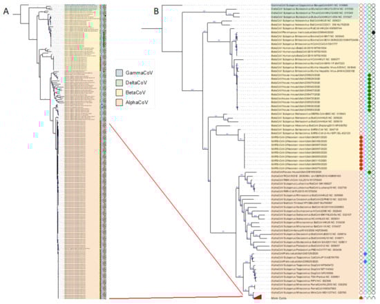 Phylogenetic relationships of the identified coronaviruses from mink and other animals from mink farms in Utah. The four genera of coronaviruses are highlighted in different colors. AlphaCoV, alphacoronavirus; BetaCoV, betacoronavirus; DeltaCoV, deltacoronaviruses, and GammaCoV, gammacoronavirus. Type species for the currently recognized subgenera are with the ICTV subgenus, strain name and the GenBank locus name. Panel A. Full phylogenetic tree (A full-size image is included in Supplementary Figure S1). Red lines designate the group of nearly identical Utah mink coronavirus strains collapsed into the colored triangle in Panel B. Circles denote animal species; red, American mink; blue, cat; green, house mouse; black, deer mouse. Filled circles denote strains characterized in this study.