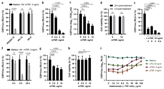 TNF antagonizes CSFV infection in porcine aortic endothelial cells and in primary porcine MDM, but not in PK-15 and SK-6 cells. (a) The PEDSV.15, PK-15 and SK-6 cells were treated with mTNF (5 ng/mL) or the medium for five hours. After the washing step with the medium, the cells were infected with CSFV-luc at a MOI of 0.1 TCID50/cell. The firefly luciferase activity in cell culture lysates was determined 20 h after infection. (b,c) Similarly, the PEDSV.15 cells were treated with increasing concentrations of mTNF prior to CSFV-luc infection and quantification of luciferase activity from cell lysates (b) or viral titers from cell culture supernatants (c) 20 h later. (d) The parallel mock- (0) and mTNF-treated CSFV-luc-infected PEDSV.15 cell cultures were analyzed for cell viability using the alamarBlue cell viability assay at the indicated times and the values are shown as percentage of untreated cells. (e) The antiviral effect of mTNF in the PEDSV.15 cells was assessed in time-of-addition experiments. (f) The pretreated cells were infected and cultured in the presence of mTNF until termination of the experiments 20 h after infection. (g) Porcine MDM were stimulated for six hours with increasing concentrations of mTNF prior to CSFV-luc infection (MOI 0.2 TCID50/cell) and measurement of luciferase activity in cell culture lysates 20 h later. (h) Viability of the TNF-treated and infected MDM was assessed in parallel as in (d). (i) The PEDSV.15 cells were preincubated for six hours with mTNF, pTNF and LPS in the presence of increasing concentrations of adalimumab, a human TNF-neutralizing antibody, prior to CSFV-luc replication analysis as described above. In panels (a,b,e–g), the firefly luciferase activity is shown as the percentage of the medium control in the absence of TNF. The data represent the mean of three (i), four (a–c,e,f), five (g,h) or 12 (d) experimental replicas with error bars indicating the standard deviations. Statistically significant differences (p < 0.05) were determined using the unpaired, two-tailed Student’s t-test (ns, nonsignificant).