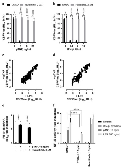 The anti-CSFV activity of TNF involves JAK/STAT signaling. (a,b) The PEDSV.15 cells were treated with pTNF (a) or IFN-β (b) in the presence of ruxolitinib (2 µM) or DMSO for six hours prior to CSFV-luc infection (MOI, 0.1 TCID50/cell) and measurement of firefly luciferase activity 22 h later. The values are shown as the percentage of the DMSO control in the absence of pTNF or IFN-β, respectively. (c,d) JAK/STAT inhibitor Compound Library screens were performed with CSFV-luc-infected cells pre-stimulated with the medium, LPS or pTNF in the presence of the individual JAK/STAT inhibitors at the concentration of 0.5 µM (c) or 5 µM (d). The data due to cytotoxic and antiviral activity of the compounds were eliminated from the analysis. (e) The PEDSV.15 cells were treated with pTNF or mock in the presence or absence of ruxolitinib for four hours, and the IFN-β mRNA to 18S ribosomal RNA ratio was quantified by means of RT-qPCR and plotted as log10 fold induction. (f) The PEDSV.15 cells were transfected with an NF-κB-dependent firefly luciferase gene reporter plasmid and treated with IFN-β, pTNF, LPS in the presence of the NF-κB signaling inhibitor TPCA-1 or the JAK/STAT inhibitor ruxolitinib. The NF-κB activity is represented as fold luciferase induction related to the medium treatment. The data represent the means and the standard deviations of three independent experimental replicas. The differences were considered to be statistically significant at p < 0.05 using the Student’s t-test (ns, nonsignificant).