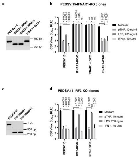 2.7. Generation of IFNAR1, IRF3 and IRF1 Gene Knockout PEDSV.15 Cell Lines Using CRISPR/Cas9 Gene Editing