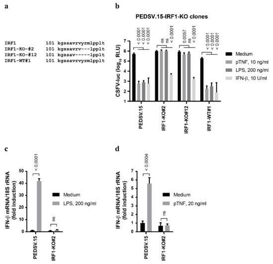 The anti-CSFV activities of LPS and TNF are IRF1-dependent. (a) PEDSV.15 cells expressing nonfunctional IRF1 were generated with CRISPR/Cas9-based genome editing. (b) Two independent knockout clones (#2 and #12) and the Cas9-exposed negative control (IRF1-WT#1) with intact IRF1 were stimulated with pTNF, LPS, IFN-β or the medium for seven hours followed by infection with CSFV-luc at a MOI of 0.1 TCID50/cell for 22 h before the cell lysates were processed for firefly luciferase measurement. (c,d) The effect of two hours of stimulations with LPS (c) or pTNF (d) on the expression of IFN-β mRNA normalized to 18S ribosomal RNA was assessed in the PEDSV.15 and IRF1-KO#2 cells. The data in (b) represent the means and the standard deviations of six independent experimental replicas and significant differences compared with the medium (p < 0.05) were calculated with one-way ANOVA and post hoc tests (p-value indicated; ns, nonsignificant). The data in (c,d) represent the means and the standard deviations of three independent experimental replicas. Significant differences compared with the medium (p < 0.05) were calculated with the unpaired, two-tailed Student’s t-test (the p-values are indicated; ns, nonsignificant).