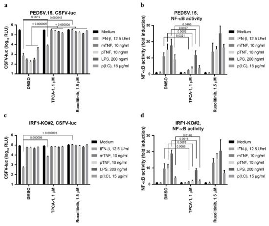 The anti-CSFV activity of TNF depends on NF-κB, but NF-κB can function independently of IRF1. The PEDSV.15 (a,b) or PEDSV.15-derived IRF1-KO cells (IRF1-KO#2) (c,d) were transfected with the NF-κB reporter plasmid 18 h prior to stimulation (b,d) or left untransfected (a,c) and stimulated with IFN-β, mTNF, pTNF, LPS or p(I:C) in the absence (DMSO) or presence of TPCA-1 or ruxolitinib at the indicated concentrations. The untransfected cells (a, c) were infected with CSFV-luc seven hours after stimulation. Firefly luciferase (a,c) or firefly and Renilla dual-luciferase activities (b,d) were measured 24 h after infection or six hours after stimulation, respectively. The NF-κB-dependent promoter activity is plotted as fold induction compared to the medium. The data represent the means and the standard deviations of at least three independent experimental replicas. Significant differences compared with the medium (p < 0.05) were calculated with the unpaired, two-tailed Student’s t-test (the p-values are indicated; ns, nonsignificant).