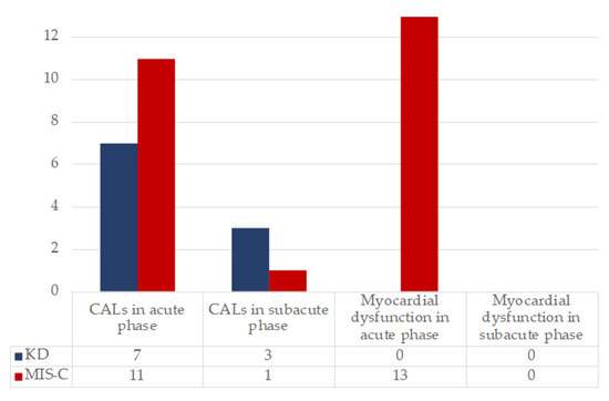 Evolution of cardiac involvement during acute and subacute phase in KD and MIS-C. On the y axis, the number of patients presenting the specific feature is reported.