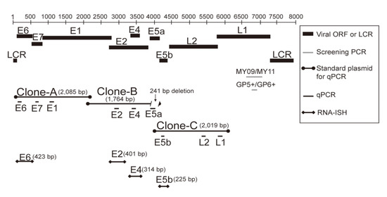 Total RNA was extracted from fresh-frozen papilloma samples and subjected to quantitative real-time PCR to measure the absolute levels of E6, E7, E1, E2, E4, E5a, E5b, L2, and L1 mRNAs, as described in our previous studies [11]. More precisely, three clones (clones A, B, and C; Figure 1) were prepared using genomic DNA and used as standards for quantification. The primers and amplification efficiency of target genes are shown in Tables S1 and S2 in the Supplementary Materials. Viral load was defined by E6 copy number/ng cellular DNA. Details of the methods are provided in the Supplementary Methods.