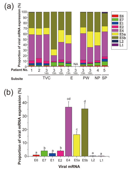 HPV-11 mRNA expression patterns in specimens with HPV-11 infection. (a) Viral mRNA expression patterns in individual cases. E, epiglottis; NA, not available; NP, nasopharyngeal papilloma; PW, posterior wall of the hypopharynx; SP, septal exophytic papilloma; TVC, true vocal cord. E4, E5b, and E5a mRNAs were predominantly expressed compared with the other mRNAs in all subsites with HPV-11 infection. (b) Proportion of mRNA expression. The probability values (p) of the Kruskal–Wallis test were < 0.0001. Values with different characters (a, b, c, d, and cd in Figure 3b) are significantly different among the viral mRNAs (p < 0.05, Dwass–Steel–Critchlow–Fligner multiple comparison tests). E4, E5a, and E5b expression together accounted for 88%, while that of E6, E7, E1, E2, L2, and L1 was only 12%.