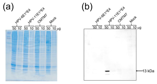 SDS-PAGE of HEK293T cells transfected with various expression vectors and Western blot analysis of the anti-HPV-11 E1^E4 antibody. (a) SDS-PAGE analysis with Coomassie brilliant blue staining. (b) Western blot analysis of the anti-HPV-11 E1^E4 antibody. Fifty or 10 μg of lysates was loaded from HEK293T cells that were transfected with pcDNA3.1+ HPV-6 E1^E4-3× FLAG, pcDNA3.1+ HPV-11 E1^E4-3× FLAG, pcDNA3.1+ CMTM7-3× FLAG, or pcDNA3.1+ (empty vector). A 13-kDa protein (HPV-11 E1^E4) was observed only in the lane of 50 μg HEK293T lysates transfected with pcDNA3.1+ HPV-11 E1^E4-3× FLAG.