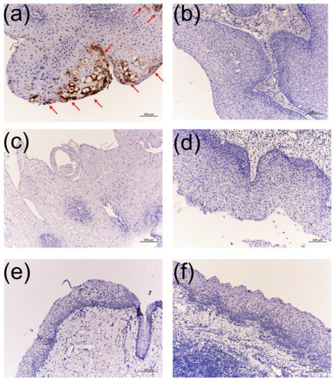 Immunohistochemistry with the anti-HPV-6 E1^E4 antibody showed positive signals in 16 of 21 HPV-6-infected LP and nasoseptal exophytic papilloma samples (Table 1 and Figure 6). A significant difference in the viral load of HPV-6 was observed between patients with positive signals (mean viral load, 450,081 copies/ng DNA) and negative signals (mean viral load, 9816 copies/ng DNA) (p = 0.0312, Mann–Whitney U-test). Meanwhile, signals were not observed in LP, normal vocal cord, chronic tonsillitis, and cancerous lesions in the laryngeal, oropharyngeal, and tongue samples without HPV-6 (Table 1 and Figure 6).