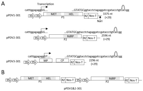 The binary vector pCB-Rz was used as the plasmid backbone of the PDV infectious clone. This vector was constructed recently [] and contains a double 35S promoter and a ribozyme sequence upstream of the terminator. The full-length cDNA sequences corresponding to the three genomic RNAs were amplified by PCR using primers which contained identical sequences to the viral RNA, and the backbone vector sequences. pCB-Rz was amplified using primers which shared sequence identity with the vector and the 5′ and 3′ termini of the viral RNA fragments (Supplementary Table S1). The sequence identity of the amplified viral cDNAs and the vector allowed for the facile cloning of three amplified RNA fragments which were separately cloned into the amplified PCB-Rz vector using the in-fusion cloning system (Takara Bio, Ann Arbor, MI, USA). Constructs containing the single viral cDNAs were named pPDV1-301, pPDV2-301 and pPDV3-301 to indicate the presence of RNA1, RNA2 or RNA3 within the PCB-Rz vector. The complete sequence of each clone was confirmed via Sanger sequencing and primer walking (Supplementary Table S1).