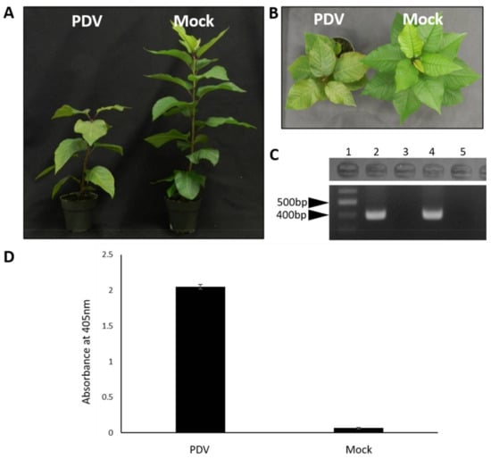 The PDV infectious clone is infectious on its natural host sweet cherry. Seedlings of cherry were agroinfiltrated with the PDV infectious clone to test the infectivity of this construct on the natural host. (A) Side view of seedlings infiltrated with the PDV infectious clone and empty vector (mock). Seedlings infected by PDV (left) have shorter internodal lengths resulting in a dwarfed or stunted phenotype compared to mock treated plants (right). (B) Aerial view of seedlings infiltrated with the PDV infectious clone or empty vector (mock). PDV infected seedlings (left) produce fewer leaves compared to mock treated plants (right). (C) The presence of PDV in upper non-infiltrated leaves of dwarfed cherry plants (left) was detected by RT-PCR. Lane 1: 1000 bp DNA ladder; 2: non infiltrated distal leaf of PDV infected cherry seedling at 8 wpa; 3: distal leaf of mock treated plant at 8 wpa; 4: a sample of foliar tissue known to be infected with PDV served as a positive control; 5: water was used as a negative control to test PCR reactions. (D) DAS-ELISA confirmed the presence of PDV in the distal, non-infiltrated leaf samples of the seedlings agroinfiltrated with the PDV infectious clone. The absence of PDV was confirmed in mock treated plants. The error bars represent the standard deviation of the means (n = 5). This experiment was performed twice, and each experiment consisted of 5 seedlings receiving each treatment.