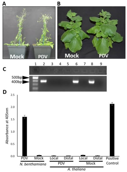 To study the viral infection cycle, and molecular virus–host interactions for the development of novel antiviral technologies, model plants are commonly used as they have a short growing cycle and are amenable to laboratory techniques such as genetic transformation []. The most used model plants in plant virology are Arabidopsis and Nicotiana benthamiana [,]. To test the infectivity of the PDV clone, rosette leaves of Arabidopsis were agroinfiltrated with an equal mixture of three cultures of A. tumefaciens strain EHA105 each harboring PDV1_301, PDV2_301, and PDV3_301. Plants were closely monitored for the development of symptoms. At 7 days post agroinfiltration (dpa), samples of the infiltrated rosette leaves were collected and frozen. At 21 dpa no disease symptoms were observed. Plants agroinfiltrated with the infectious clone could not be distinguished from plants agroinfiltrated with the empty plasmid vector pCB-Rz (mock treatment; Figure 4A). At 21 dpa, distal new leaves of the plants agroinfiltrated with the full-length cDNA clone or empty vector were collected. All tissue samples were analyzed by RT-PCR and DAS-ELISA to determine if the plants were infected by PDV. RT-PCR to detect the CP of PDV resulted in small amounts of amplicons of correct size in infiltrated Arabidopsis leaves but not in distal leaves of the same plant, nor in the mock treated plants (Figure 4C). DAS-ELISA failed to detect the viral CP of PDV in all plant tissues tested including locally infiltrated and distal tissues of PDV infiltrated, and mock inoculated plants (Figure 4D). These results suggest that the full-length cDNA clone of PDV is not infectious on Arabidopsis.