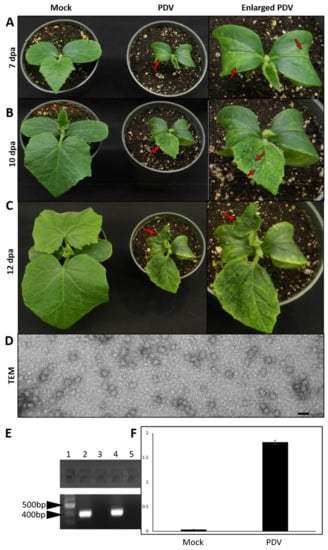 Cucumber has previously been used as an indicator host when indexing woody hosts infected with PDV []. More recently, cucumber has served as an experimental host for PNRSV []. To test if cucumber would serve as a more appropriate host to study processes such as disease symptom development, fully expanded cotyledons of cucumber were agroinfiltrated with the bipartite PDV cDNA clone. When plants were closely examined, PDV agroinfiltrated plants showed disease symptoms and these plants were easily differentiated from mock infiltrated plants (Figure 5A–C). The symptoms on cucumber progressed over time and increased in severity. At 7 dpa, chlorotic lesions were visible on agroinfiltrated cotyledons of PDV infected plants (Figure 5A, red arrows) at 10 dpa first true leaves were deformed in shape, displayed chlorotic leaf spots, and had sunken first order veins (Figure 5B, red arrows). At 12 dpa, PDV infected cucumber plants were obviously dwarfed in stature when compared to mock treated plants, additionally, newly emerging second true leaves also showed severe leaf deformation and mottled symptoms (Figure 5C). Plants which were mock inoculated with A. tumefaciens harboring the empty vector pCB-Rz did not display any symptoms at any time points (Figure 5A–C). When symptomatic cucumber leaf tissues were prepared for visualization by electron microscopy, isometric PDV virions were visible and ranged in size from 25–30 nm in diameter (Figure 5D). To confirm that these symptoms were caused by PDV infection, RT-PCR and DAS-ELISA were used and symptomatic plants were indeed positive for PDV using both tests (Figure 5E,F).