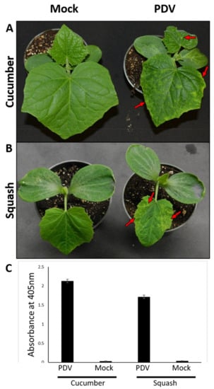 A classical method of inoculation for studying of viruses is mechanical inoculation, which predates Agrobacterium-mediated inoculation but is still widely used today [,]. To test if PDV derived from this infectious clone could be transmitted via mechanical inoculation symptomatic tissues of PDV infected cucumber plants (previously agroinfiltrated with the PDV infectious clone) were used as inoculum to rub-inoculate healthy cucumber and squash plants. At 9 days post inoculation (dpi) symptoms like those observed in agroinfiltrated cucumber plants were observed in mechanically inoculated cucumber seedlings (Figure 6A). Additionally, symptoms developed on the first true leaves of mechanically inoculated squash seen as chlorotic spots on the leaf margins (Figure 6B). For both cucumber and squash, mock inoculated plants did not display any symptoms. DAS-ELISA was used to confirm PDV was present in symptomatic plants, and absence of PDV in mock inoculated plants (Figure 6C).