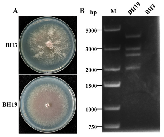 (A) Colony morphology of F. oxysporum strains BH3 and BH19. (B) Agarose gel electrophoresis of the dsRNA-enriched extract obtained by cellulose column chromatography from strains BH3 and BH19.