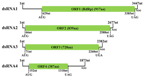 Following cDNA cloning and sequencing, the complete sequences of the four dsRNA segments found in strain BH19 were obtained, comprising a virus nominated as Fusarium oxysporum alternavirus 1 (FoAV1). The complete sequence of FoAV1 dsRNA1 (GenBank Accession No. MT659125) was 3447 nucleotides (nt) long with a GC content of 56.6%, and it contained one ORF (ORF1) that initiated at position nt 629 and terminated at position nt 3385. Based on the universal genetic code, this sequence potentially encoded 917 amino acid (aa) residues with a calculated molecular mass (Mr) of 103.4 kDa. FoAV1 dsRNA2 (GenBank Accession No. MT659126) was 2677 nt in length with a GC content of 56.8%. It contained one ORF (ORF2) that initiated at position nt 66 and terminated at nt 2588, encoding 839 aa residues with an Mr of 92.8 kDa. FoAV1 dsRNA3 (GenBank Accession No. MT659127) was 2382 nt in length with a GC content of 53.9%. It contained one ORF (ORF3) that initiated at position nt 71 and terminated at nt 2260, encoding 728 aa residues with an Mr of 78.5 kDa. FoAV1 dsRNA4 (GenBank Accession No. MT659128) was 1873 nt in length with a GC content of 55.7%. It contained one ORF (ORF4) that initiated at position nt 152 and terminated at nt 1318, encoding 387 aa residues with an Mr of 42.6 kDa. Additionally, all the four dsRNA segments contained poly (A) tails (Figure 2).