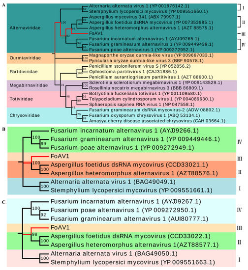 (A) Maximum likelihood phylogenetic trees based on the FoAV1 RdRp (ORF1) sequence, “Alternaviridae” family members and other related viruses. (B) Maximum likelihood phylogenetic tree based on the FoAV1 ORF2 sequence and other “Alternaviridae” family members. (C) Maximum likelihood phylogenetic tree based on the FoAV1 ORF3 sequence and other “Alternaviridae” family members. All phylogenetic analyses generated using MEGA7 with 1000 bootstrap replicates. Ⅰ to Ⅳ represent clades of the proposed “Alternaviridae” family. Different colors represent clustering in different families or clades.Ⅰ, Ⅱ, Ⅲ and Ⅳ represent different clades of “Alternaviridae” family, respectively.
