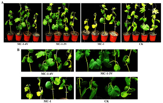Virulence of F. oxysporum MC-1, MC-1-3V and MC-1-4V strains on bitter gourd plants: (A) Wilt symptoms on bitter gourd 15 days after inoculation with 10 mL spores (107 /mL) of F. oxysporum MC-1, MC-1-3V and MC-1-4V strains, Control plants (CK) were inoculated with water. (B) Enlarged images of (Figure 8A).