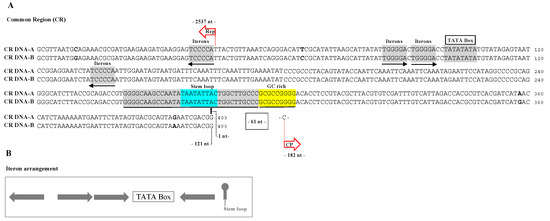 (A) Common region of OEGV-PT DNA-A and DNA-B alignment (5′–3′). Iterons and complementary iterons sequences are shown in gray, black arrows indicate their relative orientation; TATA box is shown in gray; the nonanucleotide sequence is shown in blue together with the sequences with the potential to form a stem-loop structure (in gray) to the right and to the left. The differences in the nucleotide sequences between both OEGV-PT DNAs (A and B) are shown in bold. The ↓ (black arrow) indicates position 1 in the viral genome corresponding to the predicted replication origin of the viral DNA. GC rich region in shown in yellow. (B) Iterons arrangement in OEGV-PT DNA-A and DNA-B alignment (5′–3′) positioned in relation to the TATA box and stem loop. Gray arrows indicate two iterons (virion-sense) and two complementary iterons (complement-sense).