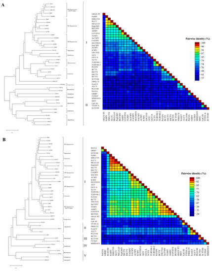- Briddon, R.W.; Patil, B.L.; Bagewadi, B.; Nawaz-Ul-Rehman, M.S.; Fauquet, C.M. Distinct evolutionary histories of the DNA-A and DNA-B components of bipartite begomoviruses. BMC Evol. Biol. 2010, 10, 97. [Google Scholar] [CrossRef] [PubMed]
