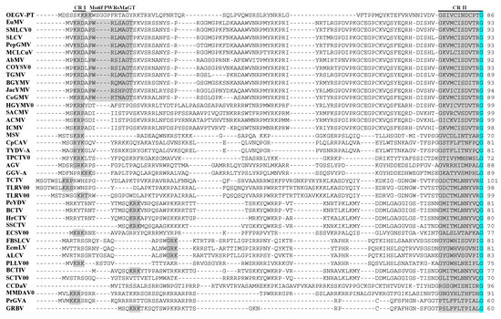 The OEGV-PT CP aa sequence displays low conserved amino acids between the geminivirus compared to Rep, however, it was interesting to verify several conserved amino acids regions (CR). Motif PWRsMaGT, conserved in the NW Begomovirus [44] is not present in the OEGV-PT. In addition, we identified several conserved regions (CR) within the geminivirus CP (CR I to CR VI) (Figure 3). These regions show many similarities with Mastrevirus corroborating our phylogenetic analysis and pairwise comparisons. Among these, CR I is conserved between OEGV-PT and the Mastrevirus (MSV) among other genera; CR III or putative motif candidates R (Rxx) presents the amino acid R, at position 132, which is conserved among geminivirus and the sequence RHT is conserved between OEGV-PT, Mastrevirus and Maldovirus. OEGV-PT also seems to be more similar to Mastrevirus and other genera in the CR V region, where it is clearly distinct from Begomovirus, that do not present this CP region. In addition, the CR VI region seems to be conserved among most geminiviruses used in this work, which may also indicate a putative motif candidates (ALY).