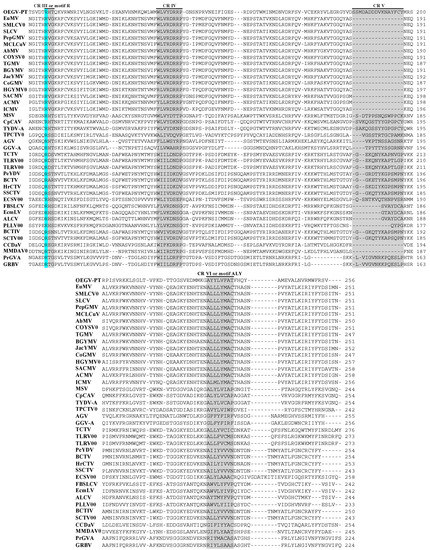 Multiple alignment of OEGV-PT CP protein sequences with most representative geminiviruses including some isolates that had not yet been classified into genera, retrieved from the GenBank database. Gray boxes are highlighting several conserved regions (CR) or motifs, and blue indicate 100% homology between the geminivirus. Conserved regions (CR) or motifs; CR I, motif PWRsMaGT (conserved on NW Begomovirus), CR II, CR III or putative motif candidates R, CR IV, CR V (amino acids enriched region in OEGV-PT) and CR VI or putative motif candidates ALY. Virus species and genera are NW Begomovirus (SLCV clade); EuMV, SMLCV0, SLCV, PepGMV, MCLCuV, NW Begomovirus; AbMV, COYSV0, TGMV, BGYMV, JacYMV, OW Begomovirus; CoGMV, HGYMV0, SACMV, ACMV, ICMV, Mastrevirus; MSV, CpCAV, TYDV-A, Topocuvirus; TPCTV0, Turncurtovirus; TCTV, TLRV00-1, TLRV00-2, Curtovirus; PeYDV, BCTV, HrCTV, SSCTV, Eragrovirus; ECSV00, Capulavirus; FBSLCV, EcmLV, ALCV, PLLV00, Becurtovirus; BCTIV, SCTV00, Grablovirus; PrGV-A, GRBV, Citlodavirus; CCDaV, Maldovirus; AGV, GGV-A, and unassigned genera; MMDaV.