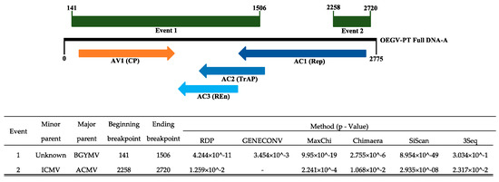 Schematic representation of the recombination events detected by RDP4.101 in OEGV-PT genome and corresponding p-values. A simplified linearized map was used to represent OEGV-PT full DNA-A. The floating boxes above the genome show the position of the two recombination events in OEGV-PT DNA-A. The floating arrows below the genome correspond to the position of each of the putative OEGV genes.