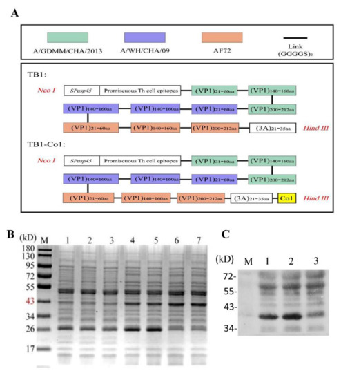 Table 2 shows the scheme for construction of FMDV multi-epitope recombinant proteins, TB1 as well as TB1-Co1, which were the immunogens are shown in Table 2. Recombinant proteins were expressed as soluble proteins in L. lactis NZ9000 using the NICE system. Strangely, we found that there was no expression of the recombinant proteins in the culture medium samples. However, we found the expression of the proteins of interest in the lysed cell supernatant. In this case, we think it may be due to the long induction time for the bacteria in the culture flask at 30 °C, which leads to proteins degradation. Schematic diagram of recombinant proteins TB1 and TB1-Co1 as shown in Figure 1A. Molecular mass for each of the two proteins was about 40 kDa (Figure 1B). Detection of recombinant proteins was carried out using anti-FMDV (serotype A) antibodies and Western blot (Figure 1C).