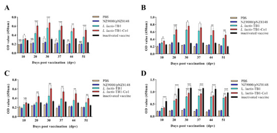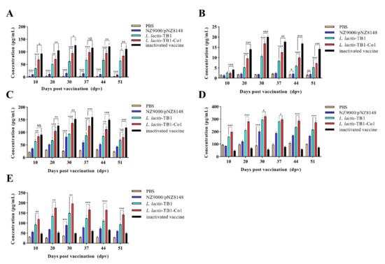 We determined serum IL-4, IL-5, IL-10, IFN-γ, and IL-2 concentrations in recombinant L. lactis administered mice on days 10, 20, 30, 37, 44, and 51. As shown in Figure 6, all the other cytokine levels continuously increased and reached their peaks at day 30 and subsequently decreased, except for the case of IL-10 which peaked on day 37 (Figure 6A–E). Concentrations of IL-4, IL-5, and IL-10 in group D mice were significantly elevated compared to group C at day 30 (p < 0.001). Compared to mice in group C, IFN-γ titers in group D were significantly elevated on days 30 (p < 0.05). In addition, IL-2 levels in groups D were markedly elevated (p < 0.01), relative to those in group C at day 30. Notably, IL-5, IFN-γ and IL-2 levels in group D were markedly elevated than those in group C on day 51(p < 0.001). Furthermore, IL-4, IL-10, IFN-γ as well as IL-2 levels in group B were significantly elevated on day 30 when compared to those of group A (p < 0.001). Therefore, L. lactis-TB1-Co1 can induce effective humoral and cellular immune responses. Moreover, live carrier L. lactis NZ9000/pNZ8148 may play an accessory function to some extent in humoral as well as cellular immune responses.