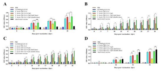 Titers of FMDV-specific antibodies in guinea pigs. (A) IgA levels in serum on days 0, 10, 20, and 30. (B) SIgA levels in anal swabs on days 0, 5, 7, 10, 15, 17, 20, 25, 27, and 30. (C) SIgA levels in saliva on days 0, 5, 7, 10, 15, 17, 20, 25, 27, and 30. (D) IgG antibody levels in serum on days 0, 10, 20 and 30. Data are shown as mean ± SD. Analyses were performed by multiple t tests (NS = p > 0.05; * p < 0.05; ** p < 0.01; *** p < 0.001).