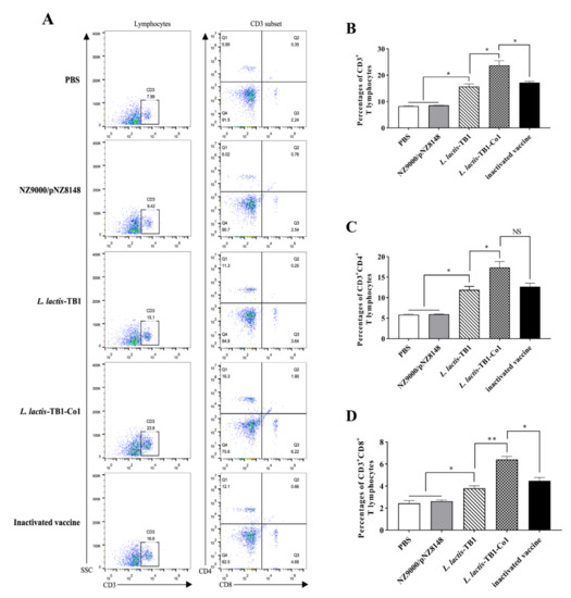Various pathogens are capable of inducing cytokine secretion by CD4+ T cells. Cytokines, which are small-molecule proteins with many biological activities, are produced by both immune as well as some non-immune cells [41]. As cell signaling molecules, they regulate immune responses, participate in immune cell differentiation and development, mediate inflammatory responses, stimulate hematopoiesis, and participate in tissue repairs. Auxiliary signals for B cell proliferation as well as differentiation are obtained from CD4+ T cells, while CD8+ T cells are cytotoxic killer cells and innate immune regulators [42]. Effector CD4+ T cells include Th1 as well as Th2-specific responses. IL-2 and IFN-γ, which are produced by Th1 cells, enhance the activation as well as proliferation of CTL, macrophages, and NK cells, promote pathogen cytotoxicity and phagocytosis, and enhance CD8+ T cell and innate immune responses [43]. IL-10 and IL-4, which are produced by Th2 cells enhance B cell proliferation as well as differentiation to plasma cells, thereby initiating antibody secretion and promoting humoral immune responses. Th1 responses, such as IFN-γ and IL-2 secretion are very effective against intracellular pathogens. Other Th2 responses, including IL-5, IL-4, and IL-10 secretions can efficiently eliminate pathogens from body fluids. In this study, L. lactis-TB1-Co1 enhanced Th1- as well as Th2-type responses, consistent with other studies [44,45]. This is due to the fact that Th cell epitopes are vital in the promotion of both humoral as well as cell immune responses by stimulating T cells [26,46]. T cell-secreted cytokines can also enhance the proliferation as well as differentiation of B cells into plasma cells [47]. Cellular immunity effectively protects against FMD [48]. Cellular immune responses are assessed by lymphocyte proliferation in vitro. Con A stimulates T cell proliferation. Our results demonstrated that L. lactis-TB1-Co1 regulated specific T lymphocyte proliferative responses, and secreted cytokines to enhance the abundance of CD4+ and CD8+ T lymphocytes in mice.