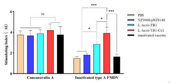 T lymphocyte proliferation levels. Splenic lymphocytes were obtained on day 30 post-vaccination and respectively induced with inactivated serotype A FMDV and concanavalin (ConA). Lymphocyte proliferation levels were evaluated by MTT colorimetric analysis. Stimulation index (SI) shows the ratio of OD490 nm of stimulated wells to OD490 nm of unstimulated wells. Data are presented as mean ± SD. Analyses were performed by two-way ANOVA test (NS = p>0.05; * p < 0.05; *** p < 0.001).