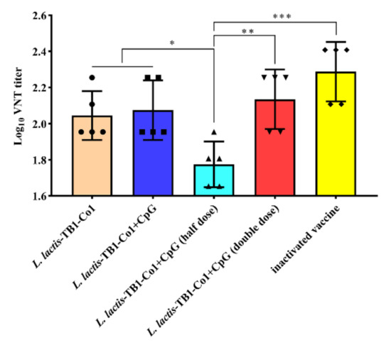 Challenge test results showed that guinea pigs immunized with L. lactis-TB1-Co1 exhibited 60% protection rates. These findings demonstrate that, to some extent, oral immunization with L. lactis-TB1-Co1 protected against FMDV. To promote the effects of immunization of recombinant L. lactis, we used an efficient oral mucosal adjuvant, CpG-ODN [49,50]. However, it was found that guinea pigs orally vaccinated with L. lactis-TB1-Co1 plus CpG-ODN did not exhibit significant protection rates. In this regard, we speculate that there are two reasons for the situation. On the one hand, it is possible that the dose of CPG ODN used is low in this experiment, which makes it unable to effectively activate B cells, monocytes, macrophages and dendritic cells to secrete antibodies, various cytokines and chemokines [50]. On the other hand, it may not be effective in guinea pigs due to differences in species. For higher protection effects, double doses of L. lactis-TB1-Co1 were administered, we found a consistent result. Interestingly, half of the dose used did not protect the guinea pigs. We found that protection rates did not increase when the vaccination volume was doubled. This outcome may be due to the ability of M cells to present antigens had reached its limit. However, it inhibited disease severity and delayed the onset of clinical symptoms, relative to negative-control animals. Thus, L. lactis-TB1-Co1 may have led to the production of specific neutralizing antibody titers. As previously reported [26,51,52], there was not a strong association between neutralizing antibodies and protection. It has been proven that interferon-mediated cellular immunity can protect pigs from FMDV infection [53,54]. Thus, to evaluate the efficacy of vaccines for FMD, in addition to in vitro neutralizing activities, cellular immune responses, antibody affinities and other antibody responses, should be considered [26].