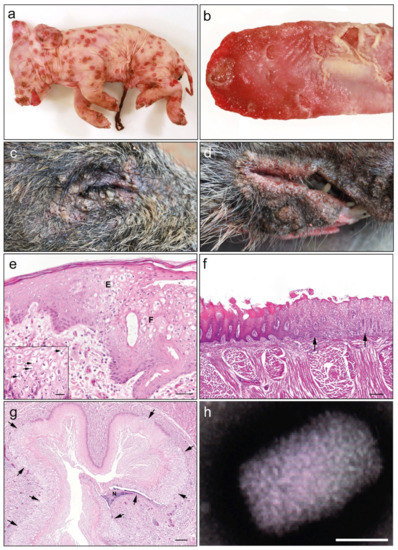 Pathological and ultrastructural investigation of tissues from animals diagnosed with SWPV infection. (a) Macroscopic skin lesions visible as multifocal severe, erythematous maculae on a SWPV-infected piglet. (b) Tongue of a one-day-old SWPV-infected piglet with multifocal coalescing vesicular to bullous lesions and consecutive erosions. (c,d) Macroscopic skin lesions consisting of multiple crusted pustules surrounding the eye (c) and lip (d) of a juvenile wild boar. (e) Skin of a one-day-old piglet infected with SWPV characterized by ballooning degeneration of the epidermal (E) and follicular (F) epithelial cells; HE, bar = 100 µm; inset: higher magnification reveals cytoplasmic eosinophilic inclusion bodies in degenerated epidermal cells (arrows); HE, bar = 20 µm. (f) Tongue of a one-day-old piglet infected with SWPV characterized by focal severe ballooning degeneration of the epithelial cells (arrows); adjacent regular epithelial lining; HE, bar = 200 µm. (g) Esophagus of a one-day-old piglet infected with SWPV characterized by multifocal severe ballooning degeneration of the epithelial cells (arrows); focal intraepithelial necrosis (N); HE, bar = 200 µm. (h) Ultrastructure of a characteristic orthopoxvirus particle in the skin of a piglet demonstrated by negative staining, bar = 100 nm.
