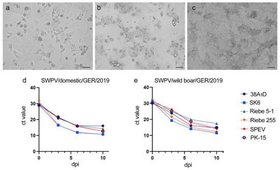 SWPV infection of porcine cell lines. (a–c) Characteristic cytopathic effects including cell rounding, ballooning and vacuolization were observed in PK-15 cells infected with a German domestic pig SWPV strain (SWPV/domestic/GER/2019) (a) and German wild boar SWPV strain (SWPV/wildboar/GER/2019) (b), but not in mock-infected PK-15 cells (c). Scale bars, (a,b) 30 µm, (c) 75 µm. (d,e) Porcine kidney cell lines (SPEV, SK6 and two PK-15 subclones), porcine testis epithelia cells (Riebe-255) and a porcine lymphoma cell line (38A1D) were infected with SWPV/domestic/GER/2019 (d) and SWPV/wildboar/GER/2019 (e). Supernatants were collected at three, six and ten days post-infection and ct values were determined in triplicate by qPCR.